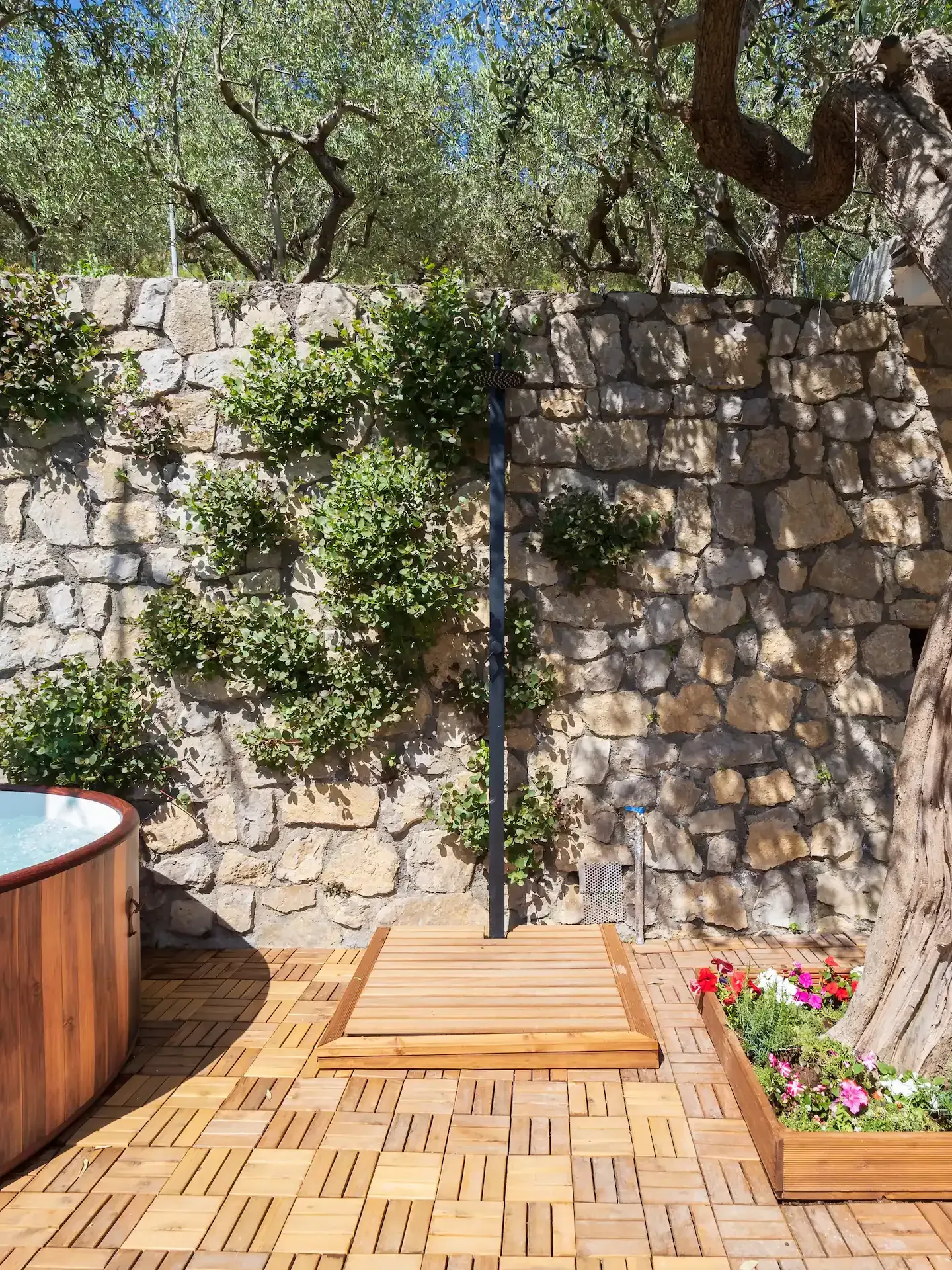 Il nostro patio esterno è il cuore del relax, un'oasi di tranquillità dove natura e comfort si fondono armoniosamente. Qui, un angolo con vasca idromassaggio invita a concedersi momenti di puro benessere, mentre la zona living, elegantemente arredata, è il luogo ideale per godersi appieno il panorama mozzafiato.